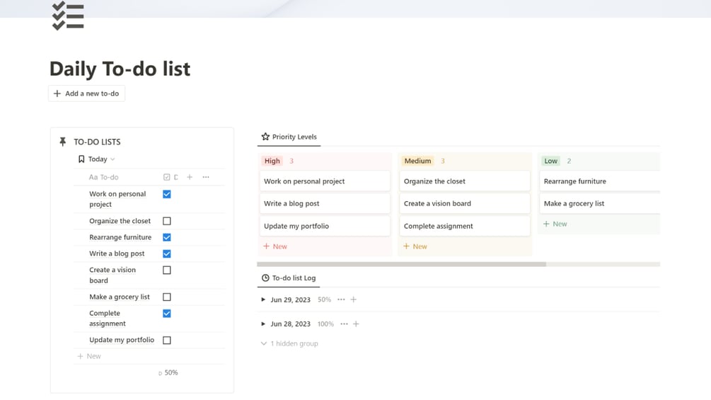 The Daily To-Do List Notion template is a simple tool to stay on top of your daily tasks. The Today section shows you all of your tasks for the current day with a progress indicator. The Priority Levels section shows you all of your tasks grouped by priority level (high, medium, low). The To-Do List Log section shows you a history of your past to-do lists with the completion progress for each task. This template also includes a quick add feature that allows you to quickly add new tasks to your list.