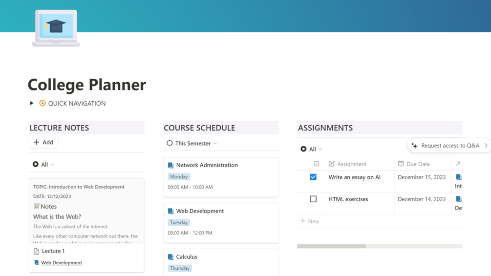 This College Planner Notion template helps you to keep track of your course schedule and assignments, organize lecture notes, and never miss important events, all in one place.