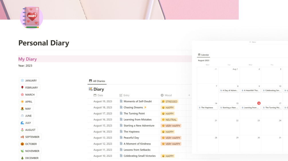 The Personal Diary Notion template includes a section for each month of the year. This way, you can easily keep track of your diaries over time.