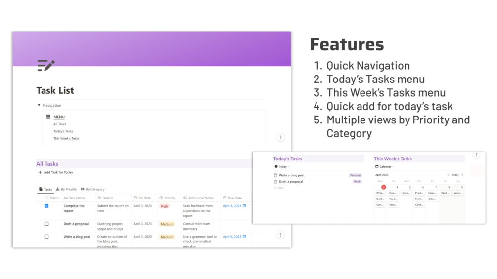 If you're looking for an efficient way to manage your tasks, this Task List Notion Template is the perfect solution! With it's quick navigation and multiple view options, you can easily view tasks for the day, week, or by priority and category. Plus, the best part is that it's completely free!