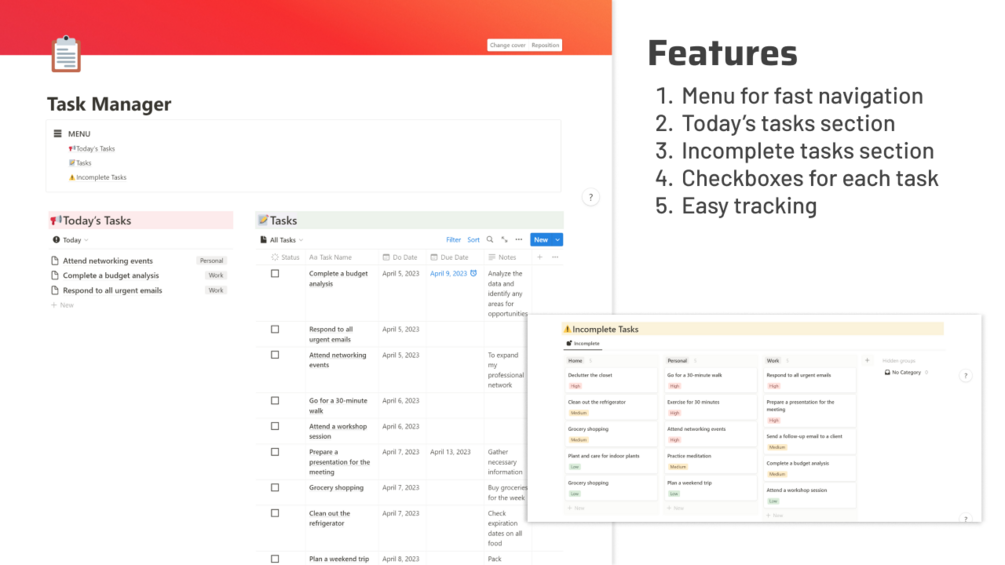 This task manager template is an easy-to-use tool that helps you stay organized and get things done. The focus of this task manager template is to help you get things done effectively.